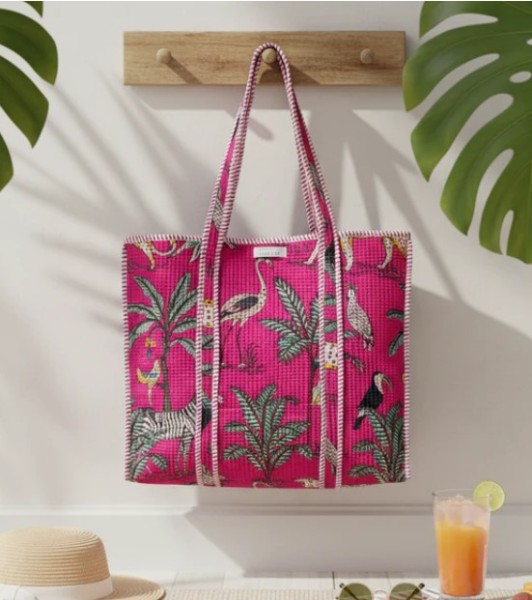 Création originale de Mademoiselle Azalée à Agen, ce sac en 100% coton matelassé associe confort et élégance. Inspiré du block print indien, il présente un imprimé fleuri raffiné sur fond kaki, avec une face réversible à rayures, idéale pour varier les styles.